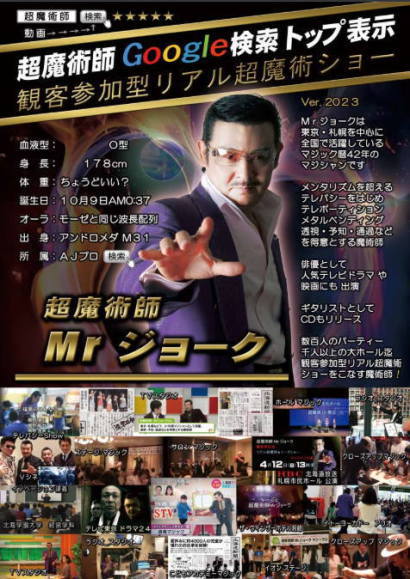 マジック歴43年を誇り、テレパシーやテレポーテーションなどのリアル超魔術を得意とし、観客参加型のショーで数百人から千人以上のホールまでを魅了しています。